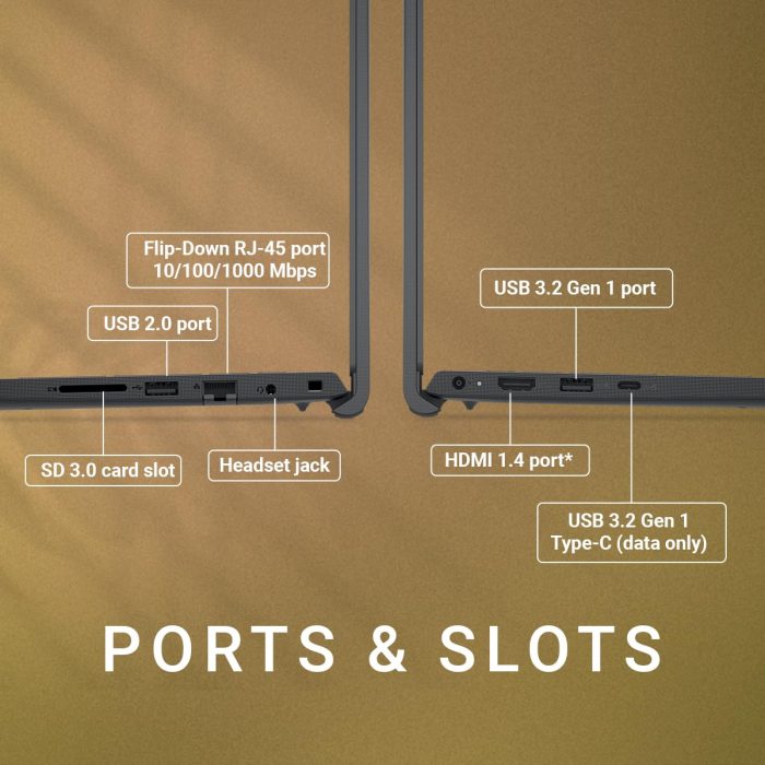 Ports: 1 USB 2.0 port, 1 Headset jack, 1 HDMI 1.4 port*, 1 Flip-Down RJ-45 port 10/100/1000 Mbps, 1 SD 3.0 card slot, 1 USB 3.2 Gen 1 port, USB 3.2 Gen 1 Type-C (data only)