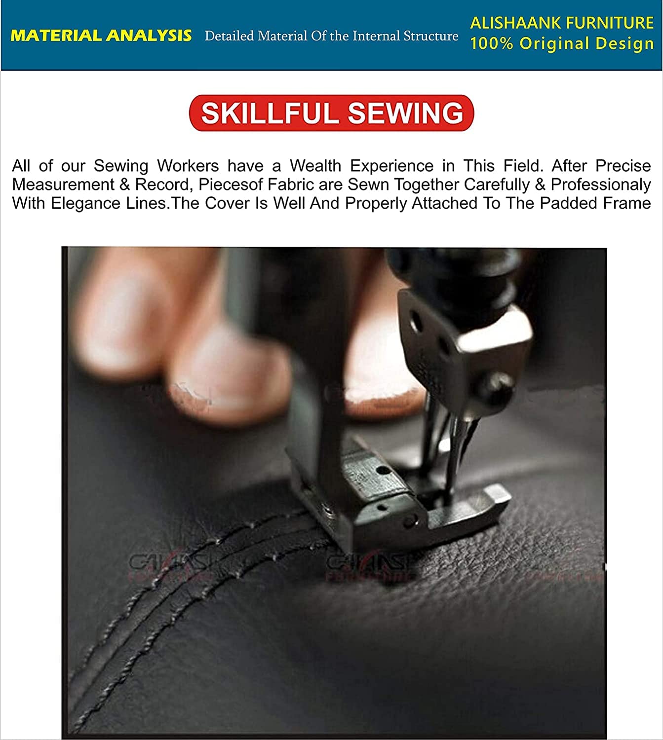 Primary Material: Wood, Upholstery Material: Leatherette/ Sofa is made out of compliance material like kiln dried wood reinforced with Furniture grade engineered wood.Polyurethane foam with 40 kg per cubic meter density for seats and 28kg per cubic meter for arms and back.