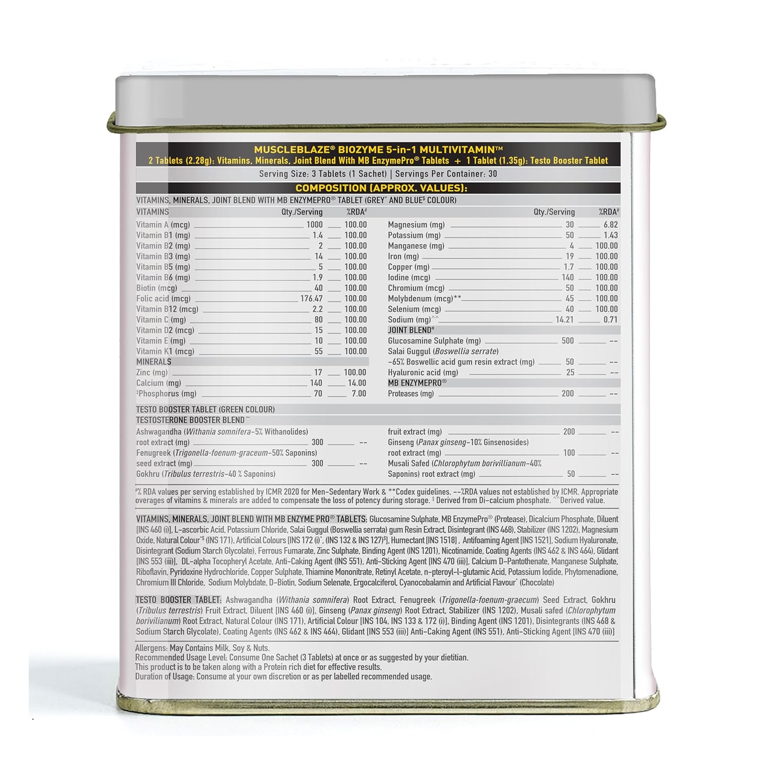 JOINT BLEND: When you are an advanced gym-goer, you have no room for joint discomfort, pain, or inflammation. MuscleBlaze Biozyme Daily Multivitamin for Men contains a joint blend that assists in mobility, flexibility and upkeeps the health of your joints