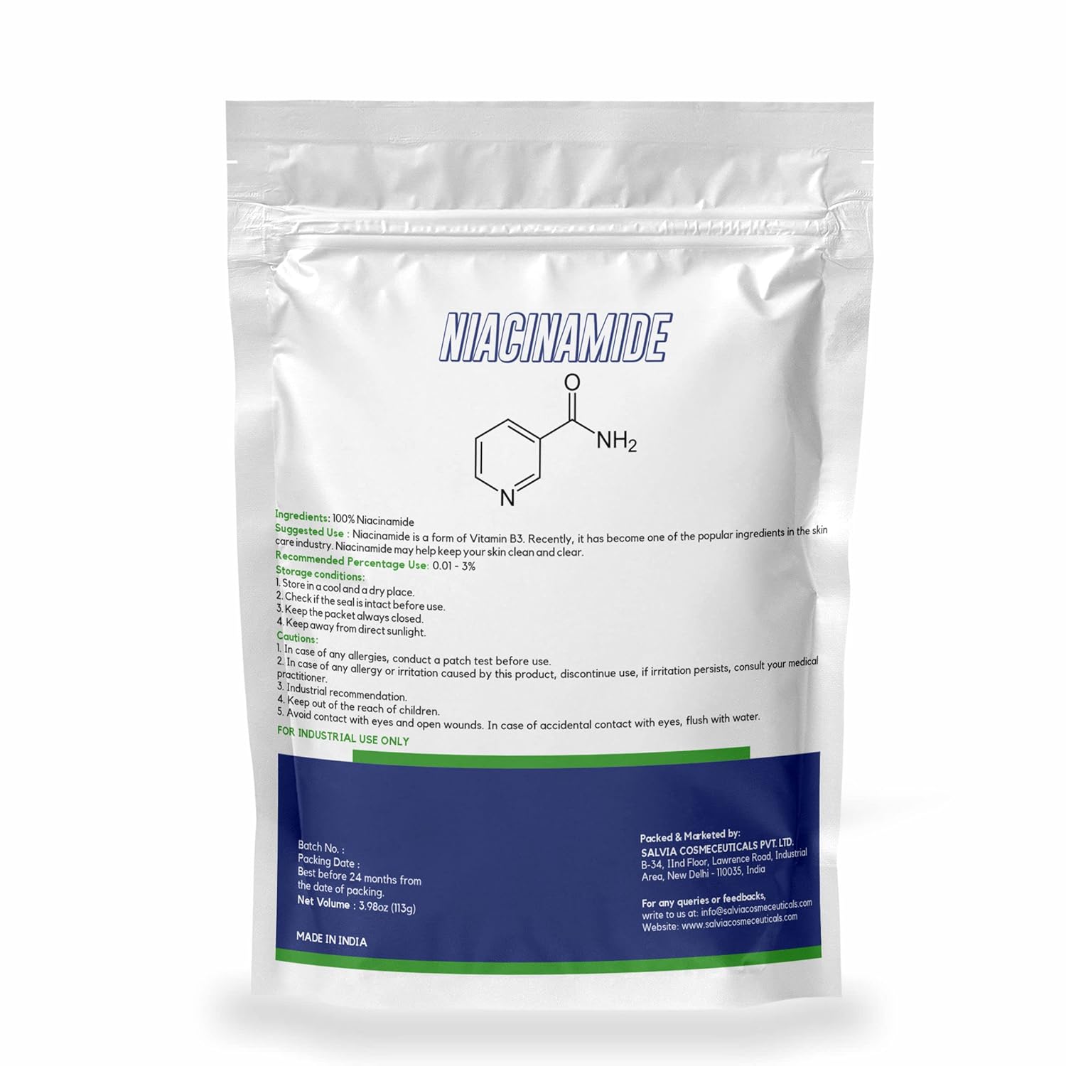 USES: MYOC Niacinamide powder may improve skin texture by diminishing dull skin appearance and dark spots. It is commonly used to prepare cosmetic formulations like skin moisturisers, Lotions, toners, serum & creams.