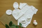 A perfectly delightful cotton onesie/romper-cap-booties-mittens combo/newborn baby clothing set that is aesthetically beautiful and practically useful for new parents.