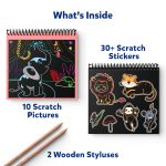 INCLUDES: 10 Scratch Pictures, 2 Wooden Styluses, 30+ Scratch Stickers