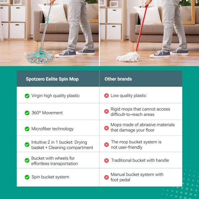 Keep your home or office squeaky clean with Milton’s Spotzero Elite Spin Mop. The microfiber cloth has superior water absorbency and additionally, it is non-abrasive and lint-free. . Since the Elite Spin Mop is equipped with large wheels, it can be easily pulled around without much effort which reduces physical exertion.