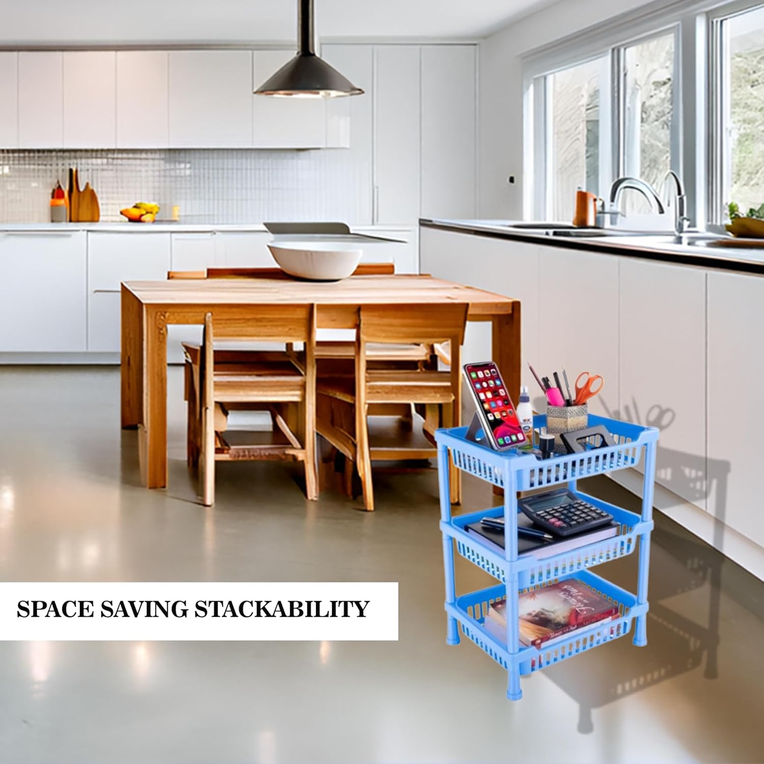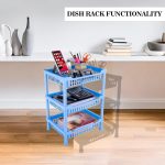 Multi-Level Storage: Our trolley boasts three spacious and stackable shelves, providing you with ample room to store kitchen essentials, including fruits, vegetables, dishes, utensils, and more. Maximize vertical space and keep everything neatly organized.Dish Rack Functionality: No need to worry about drying dishes on your countertop anymore. The integrated dish rack on the top shelf allows you to air dry your plates, bowls, and cutlery conveniently. Say goodbye to unsightly water puddles.Versatile and Multipurpose: This trolley is not limited to the kitchen alone. Its versatile design makes it suitable for use in various areas of your home, from the bathroom to the pantry, laundry room, or even as a mobile storage solution in your home office or craft room.Sturdy and Durable: Crafted from high-quality plastic, our trolley is built to withstand everyday wear and tear. The sturdy construction ensures it can carry a variety of items without buckling, ensuring long-lasting use.Space-Saving Stackability: When not in use, simply stack the shelves for compact storage. This feature is perfect for those with limited kitchen space or for those who want to store the trolley away when it’s not needed.