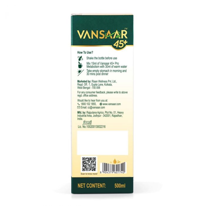 Improves Metabolism for effective weight management- Vansaar 45+ Pro Metabolism is a perfect addition to your daily diet and improves the metabolic rate for effective weight management. It works by balancing the acidity levels of the body and reducing hunger pangs.