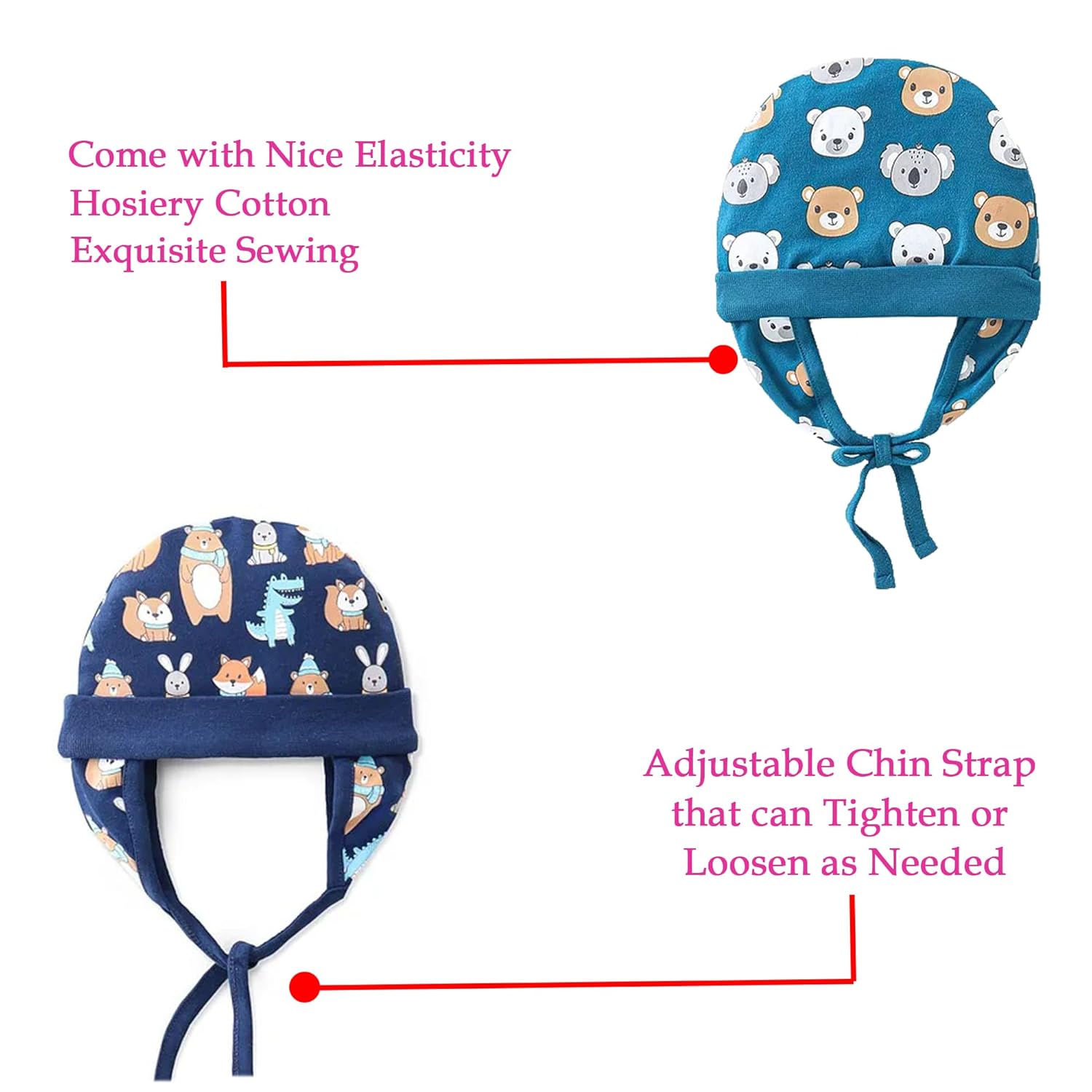 These cute caps are specially designed with tie & knot closure to provide a snug fit. It is easy to wear. It is stretchable and can be easily adjusted on baby’s head. Due to this closure pattern it cannot be easily removed by kids while playing.