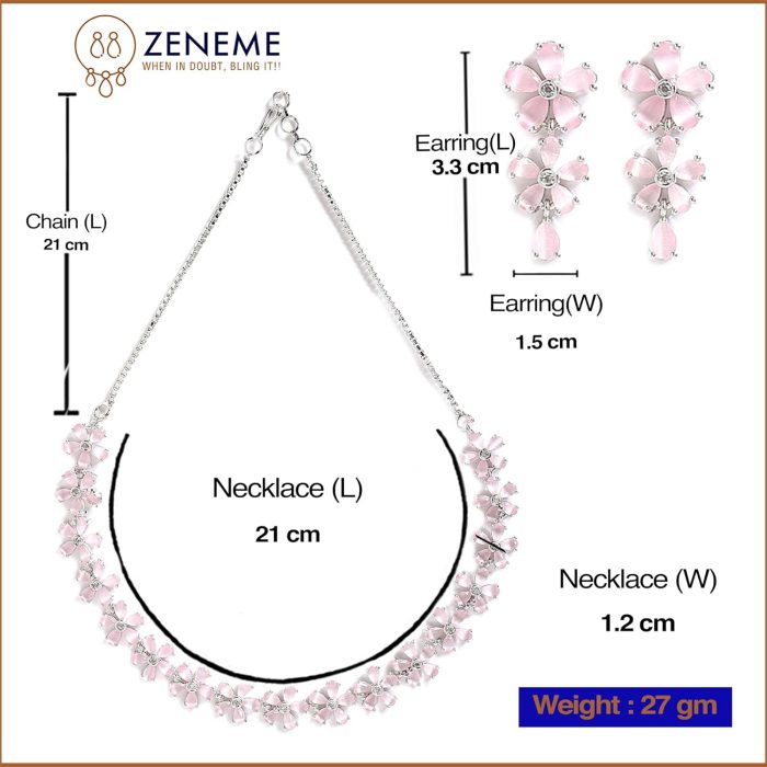 From the house of Zeneme, these Traditional necklaces add a hint of raw ethnic beauty to any look. Representing a classic fusion of exquisite craftsmanship and feminine elegance, this set will definitely be a treasured inclusion in every woman’s jewellery collection. The American Diamond Studded Rhodium Plated Silver Toned Necklace jewellery which is Modern design for a type look desired by women along with a pair of matching earrings. Best worn with saree, suits and lehenga. A simple piece that can boost confidence and is definitely a must-have relevant for all the age groups of women.