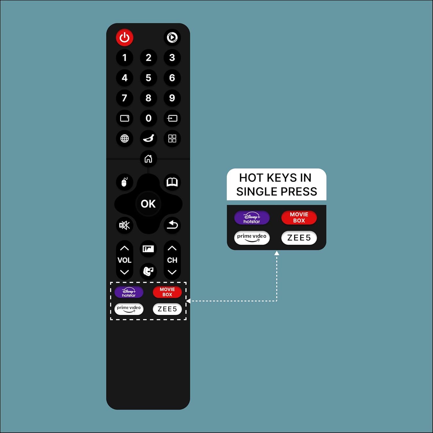 【HOT-KEYS】 Get quick access to your favourite content or Live TV with preset app buttons for Hotstar, Movie Box, Prime Video, Media and ZEE5